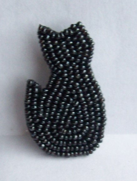 Tissu brodé de perles puis assemblé à un support en forme de chat